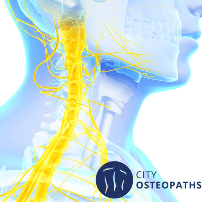 The vagus nerve is the tenth cranial nerve, and runs from your skull down both sides of the neck and chest to your abdomen and internal organs.