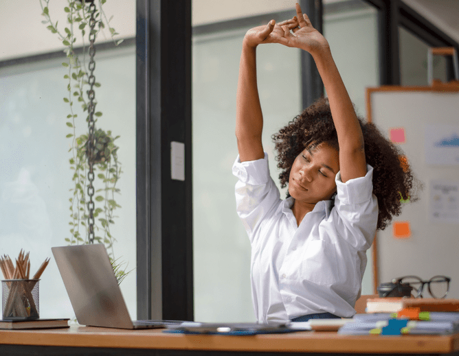 Purpose: This stretch helps counteract the forward hunching posture common with desk work by promoting extension through the thoracic spine and opening up the rib cage.