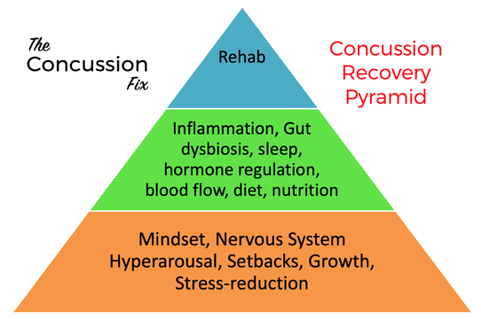 As with anything, getting the foundation right is key to building on it and ensuring you reach your goals — and stay there. Here’s a Concussion Recovery Pyramid (from Complete Concussions and The Concussion Fix) that helps to understand how the building blocks of recovery are organised.