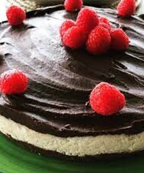 It's based on a 'Bounty Bar' - dark chocolate and creamy coconut. Delicious on its own or with berries - here with fresh raspberries for that Christmassy look.