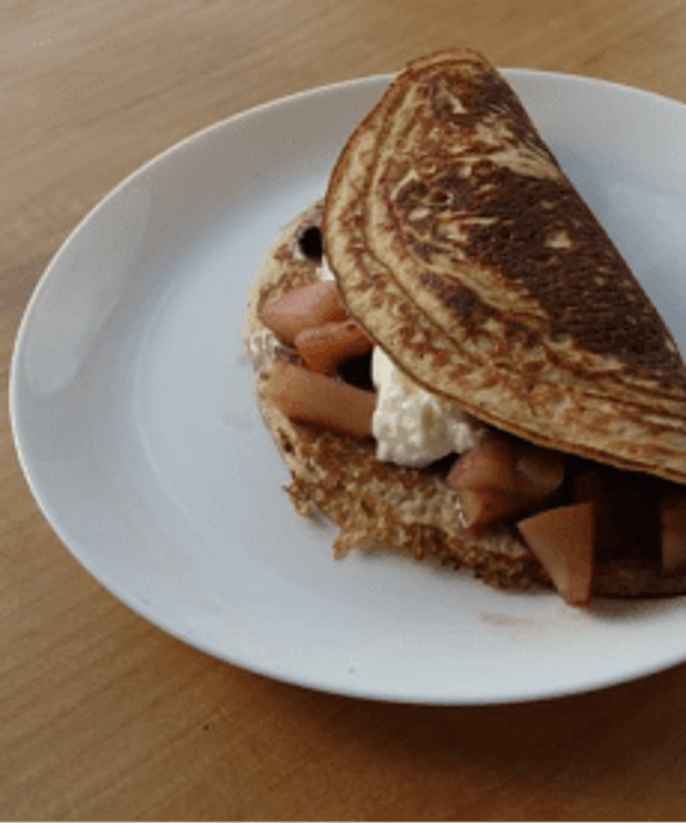 It is easy to make in that you put all the ingredients into the blender or food processor, whiz it up, then just pour the mixture into a suitably hot pan. I use organic butter, but you could use ghee or coconut oil. It also makes very good pikelets which will keep a day in the fridge. I have always found the mix to hold together well and turn easily in the pan. We use a solid stainless steel pan, as we found that even good quality non stick only lasts a short time before it is stratched and not safe to use.